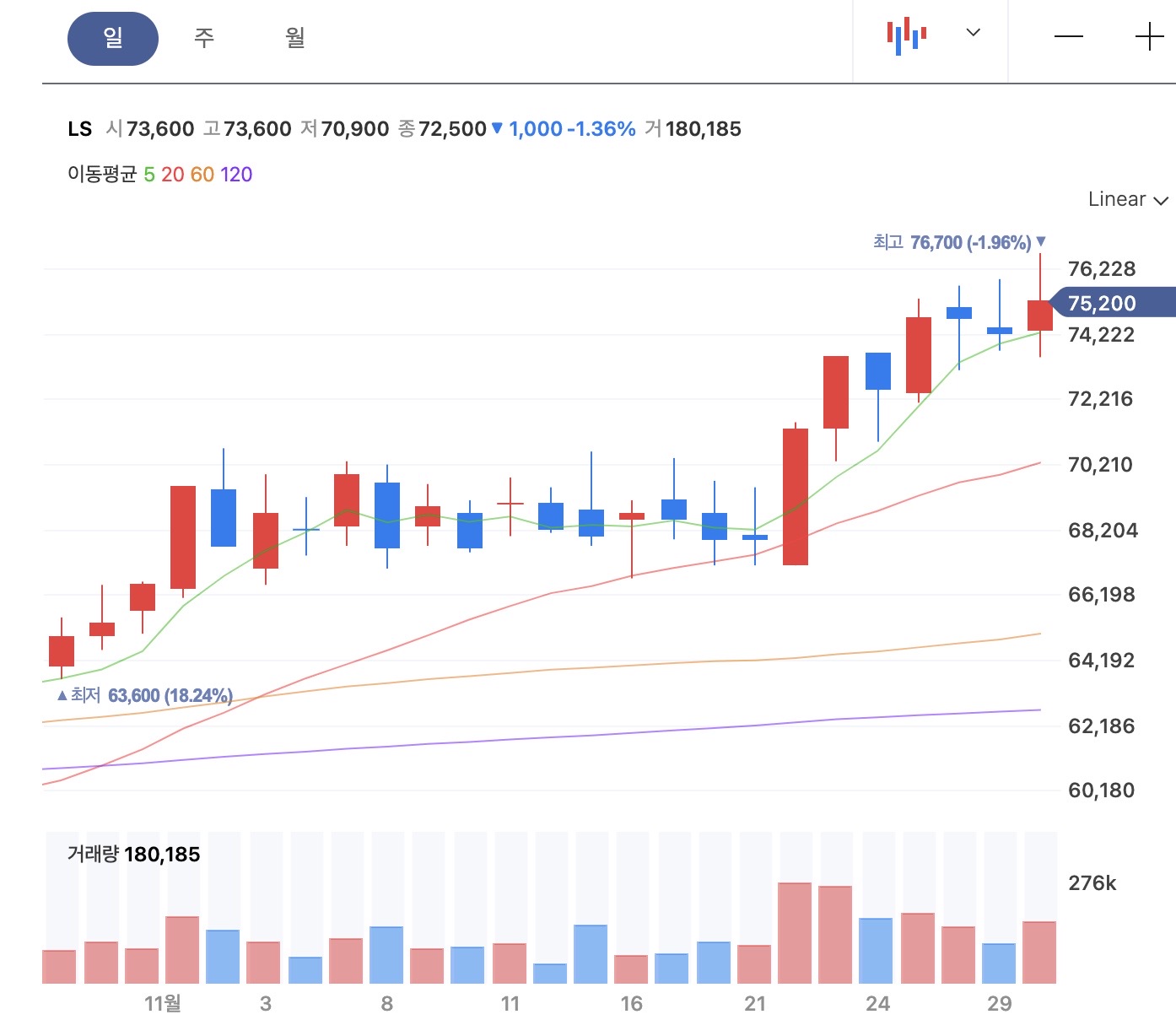 LS가 어떤 흐름을 보였는지 궁금했다. 처음 기사를 쓸 당시 주가가 68,200원이었다. 오늘 LS의 주가는 75,200원이다. 10%상승했다. 내가 관심을 가졌을 때 매수하고 한 달 보유했다면 10%의 수익을 보는 것이다. 나는 이런 식으로 계속 관심을 가져야겠다.